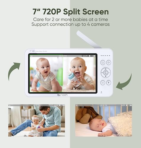 - 【Effortlessly Take Care of Two Babies】-bonoch baby monitor with 2 cameras allows you keep an eye on both babies on the screen side by side with split screen function. The 7" 720P HD display provides crystal-clear quality with sharp pictures and 10X more detail. The bonoch baby monitor loops video from 4 cameras every 15s in single-screen mode or every 30s in split-screen mode. Say goodbye to the hassle, and hello to a simpler, more efficient way to care for your little ones