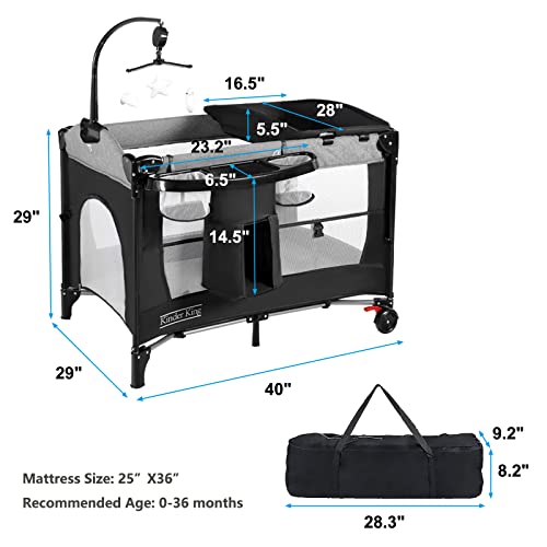 Kinder King 4 in 1 Portable Nursery Center, Foldable Baby Bedside Crib w/Bassinet, Infant Pack n Play Playard Toddler Large Playpen, Newborn Changing Table, Storage Basket, Side Zipper