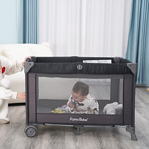 - 【All-in-one Baby Playpen】 Pamo Babe 4 in 1 Baby Playpen accompanies the growth of your baby. The design of the diaper table allows the mother to easily change diapers, and the comfortable playard provides a place for the baby to rest. In addition, the soft mattress offers comfortable lying experience(Suitable Mattress Pad's Size: 38.6''x24.4''). Morever, the portable bassinet makes it more convenient for you to carry around.