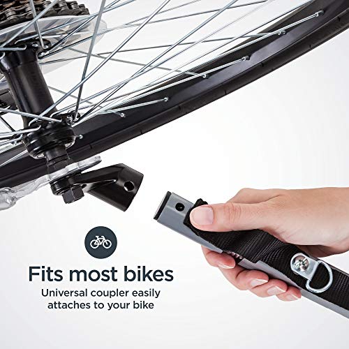 - Tow behind style bike trailer, universal bike coupler will fit most bicycle rear wheels, 5-point rider harnesses with shoulder patches, safety flag for extra visibility